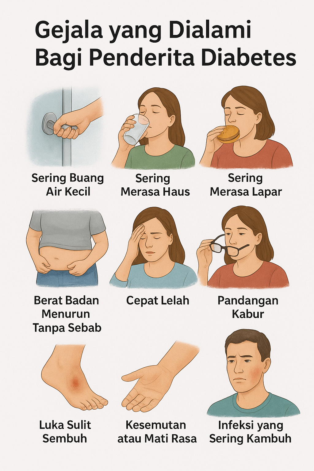 Gejala diabetes sering kali tampak ringan pada awalnya, namun dapat berkembang menjadi serius jika diabaikan. Oleh karena itu, penting bagi setiap orang untuk mengenali gejala sejak dini, seperti sering buang air kecil, haus berlebihan, lapar berlebih, penurunan berat badan tanpa sebab, cepat lelah, hingga luka yang sulit sembuh.